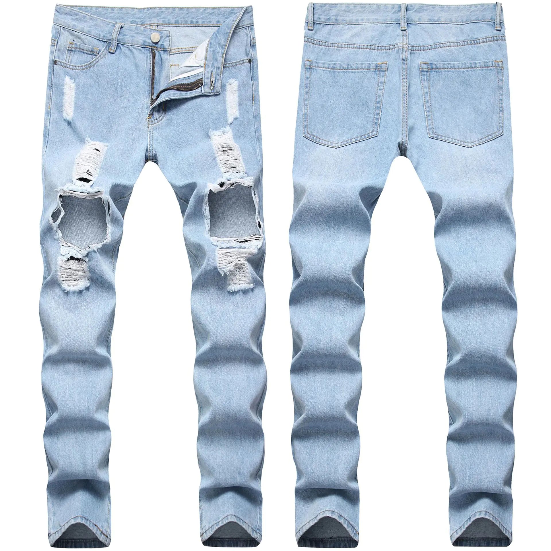 Elevate your casual wardrobe with our stylish Men's Light Blue Ripped Jeans, designed for comfort and flair. These jeans feature a straight cut that complements any body type, making them a versatile addition to your wardrobe. Crafted with special techniques such as embroidery, washing, and fraying, each pair showcases a unique character that sets you apart from the crowd.